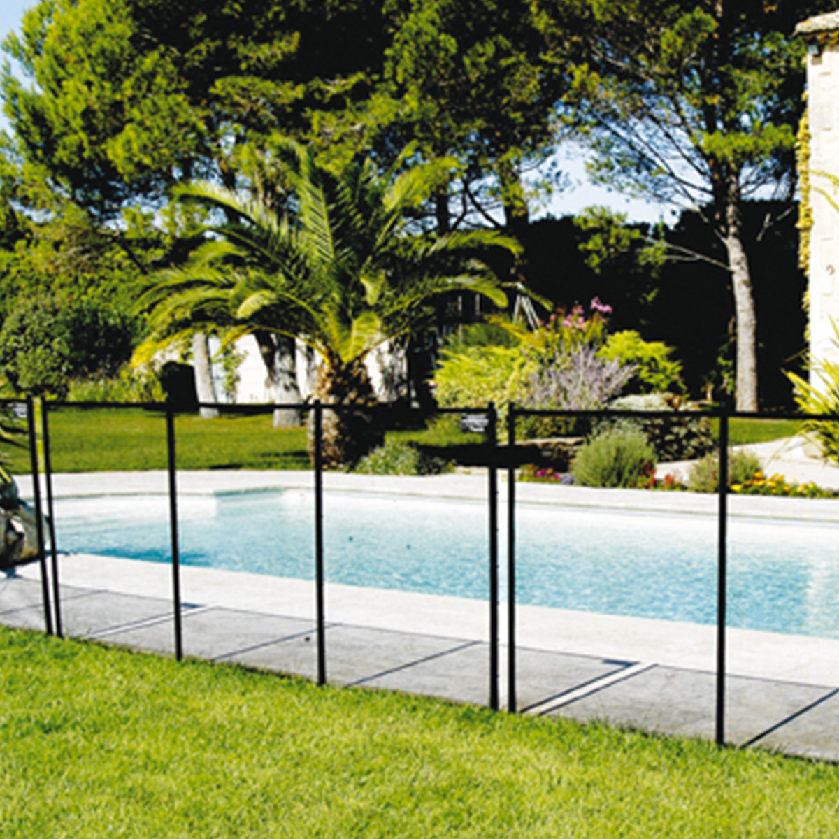 Ancrée dans le sol, la barrière ne s’ouvre que d’en haut, et rend donc votre piscine inaccessible pour les petits enfants.